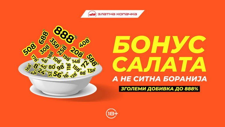 Во сите обложувалници на Златна Копачка, ве очекува бонус од 8 до 888%, со кој како што пренесуваат може да се направиш „салата“ на добивките во следниот месец.