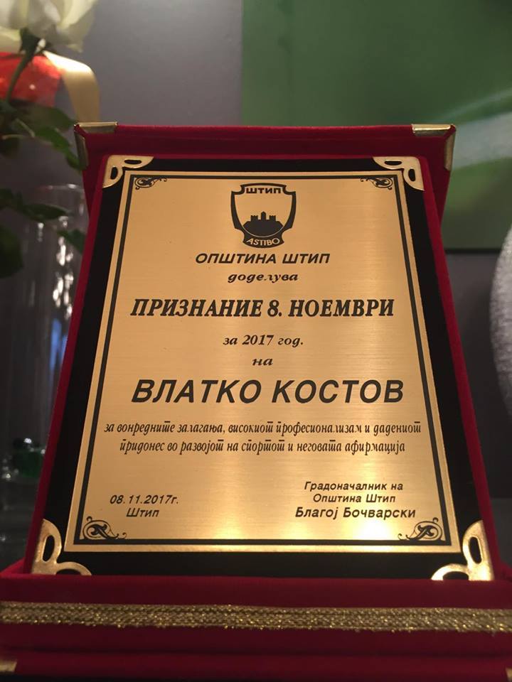 Општина Штип за Денот на ослободувањето на градот, 8 Ноември, подели признанија за луѓето кои дале свој придонес во афирмација на градот, а заслужена награда доби и фудбалскиот стратег Влатко Костов. Тој јавно се заблагодари за огромното признание, со оглед дека поради куп-натпреварот против Скопје не можеше да биде лично присутен на манифестацијата.
