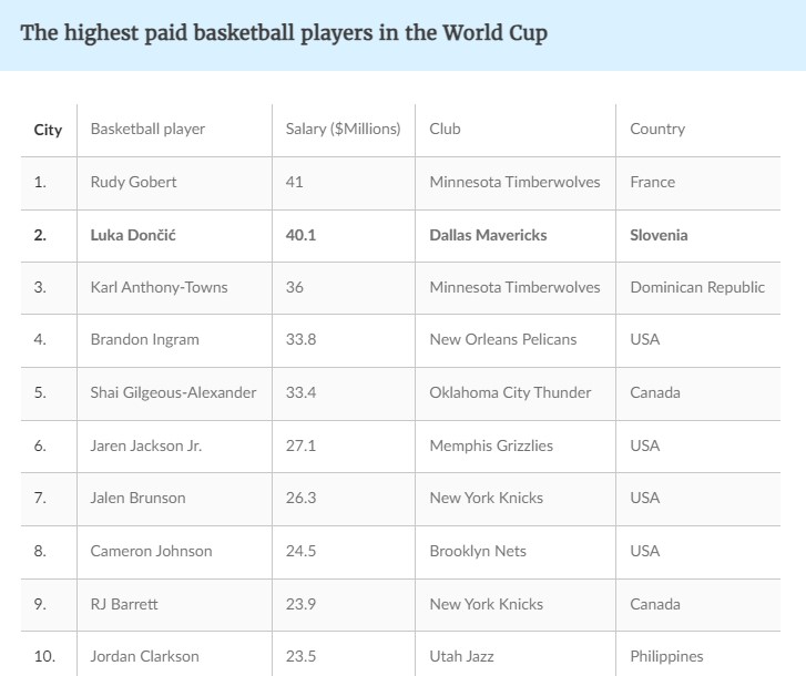 Објавена е и ранг-листата на најплатените кошаркари кои ќе бидат дел од претстојниот светски шампионат. Очекувано, најдобрите десет доаѓаат од НБА-лигата, но мело изненадување е што во Топ 5 се најде само еден Американец, и тоа Брендон Инграм, кој според договорот со Њу Орлеанс сезонава заработи 33,8 милиони долари, доволно само за четврто место во рангирањето.
