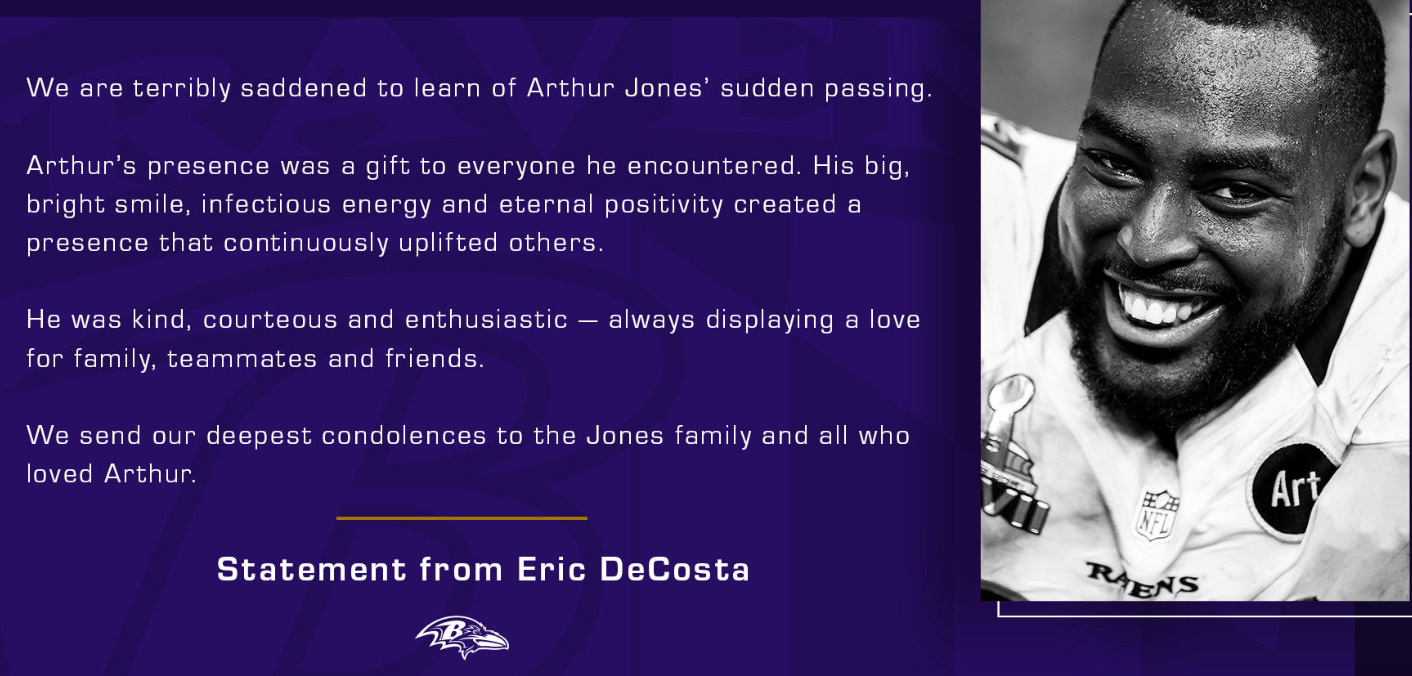 „Неверојатно сме тажни поради ненадејната смрт на Артур Џонс. Неговото присуство беше подарок за сите околу него. Неговата насмевка, енергија и неисцрпна позитивност го правеа секогаш да ги крева луѓето. Беше нежен, храбар и полн со ентузијазам, а љубовта што ја покажуваше кон своето семејство, пријатели и соиграчи ќе се памети засекогаш“, велат од Балтимор.