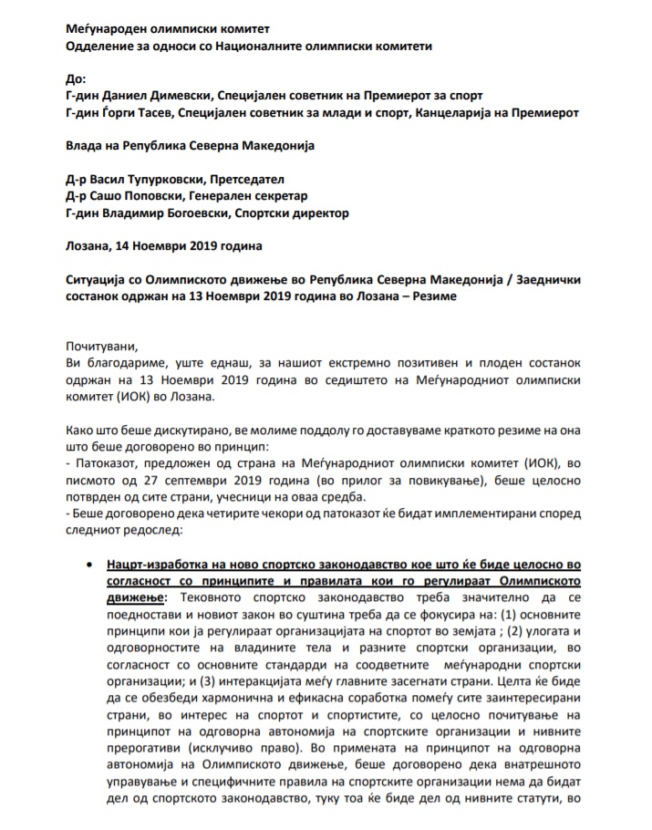 Ова било договорено на средбата во Лозана на која Интернационалниот олимписки комитет ги свика претставниците на Македонскиот олимписки комитет, претставниците на државните тела задолжени за спорт. Пристутните на состанокот ја прифатиле оваа рамка. На средбата не присуствувал директорот на Агенцијата на млади и спорт, Дарко Каевски, биле двајцата советници за спорт на Премиерот како и делегацијата на МОК.