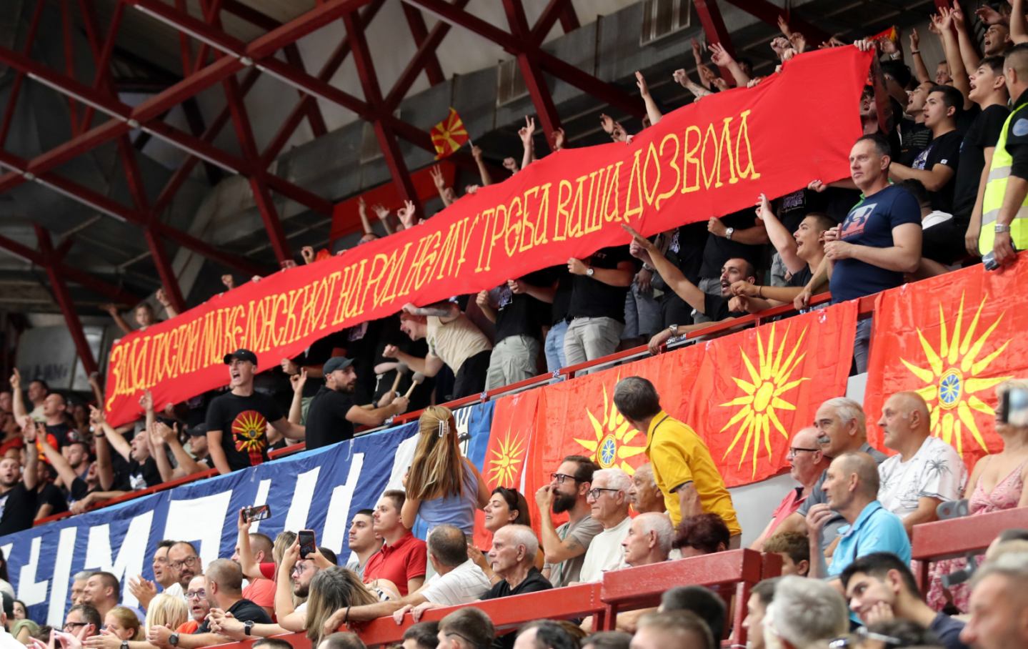 На трибините на кои се наоѓаат едни од најжестоките навивачи во Македонија, популарните „Кумани“ одекна и порака: „За да постои македонски народ не му треба ваша дозвола“ која наиде на огромна поддршка од присутните.