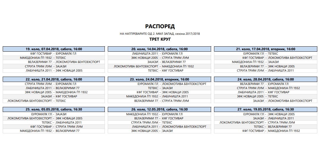 По одигрувањето на 18. коло во Втората фудбалска лига – Исток и Запад, на ред е третиот круг од натпреварувањето во кој ќе се играат уште девет кола. Третиот круг стартува на 7 април од 16 часот, а последното коло е планирано да се игра на 19 мај.