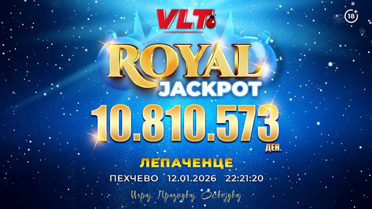 РОЈАЛ ЏЕКПОТ добивката во вредност од 10.810.573 денари е освоена на 12.01.2026 година, на ВЛТ локацијата Лепаченце во Пехчево. Ова е петта освоена РОЈАЛ ЏЕКПОТ добивка во рамки на актуелниот празничен период, во кој беше забележан и рекорден износ од 11.225.392 денари, освоен на 27.12.2025 година.
