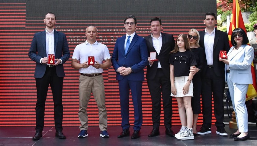 Претседателот на Македонија Стево Пендаровски со Медал за заслуги ги одликува Лазар Лечиќ, постхумно – Благоја Георгиевски Буштур, Владимир Богоевски, Насе Насев и Борче Костовски на денешната манифестација во вила „Водно“.