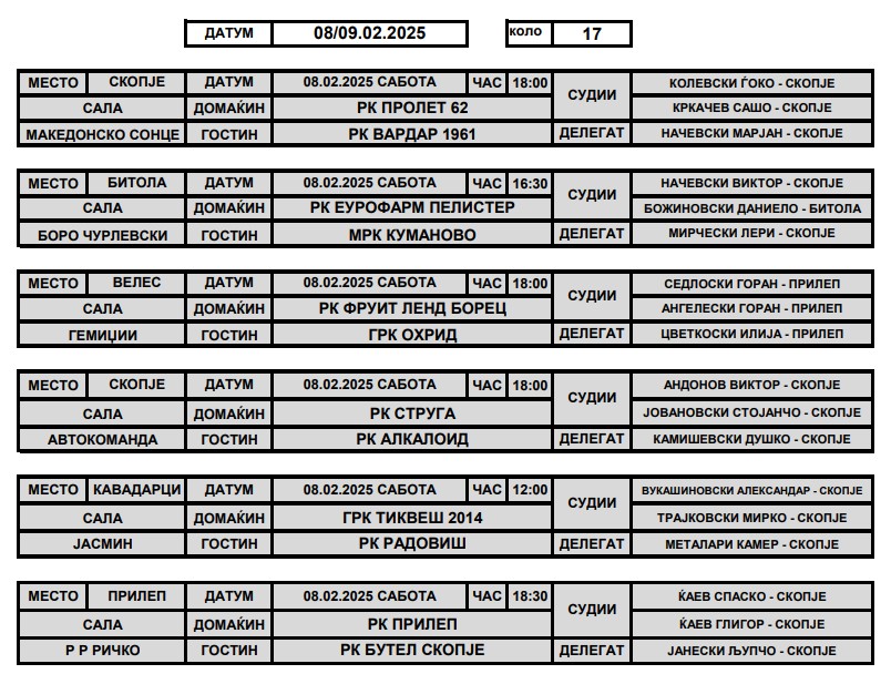 Алкалоид ја има улогата на лидер на табелата по првите 16 рунди, а тимот предводен од Кире Лазаров би требало да има лесна задача на денешното гостување во Струга. Актуелниот шампион Е. Пелистер важи за апсолутен фаворит на домашниот дуел со МКК Куманово, додека Вардар го очекува скопска пресметка со Пролет, на која „црвено-црните“ ја имаат фаворитската улога.