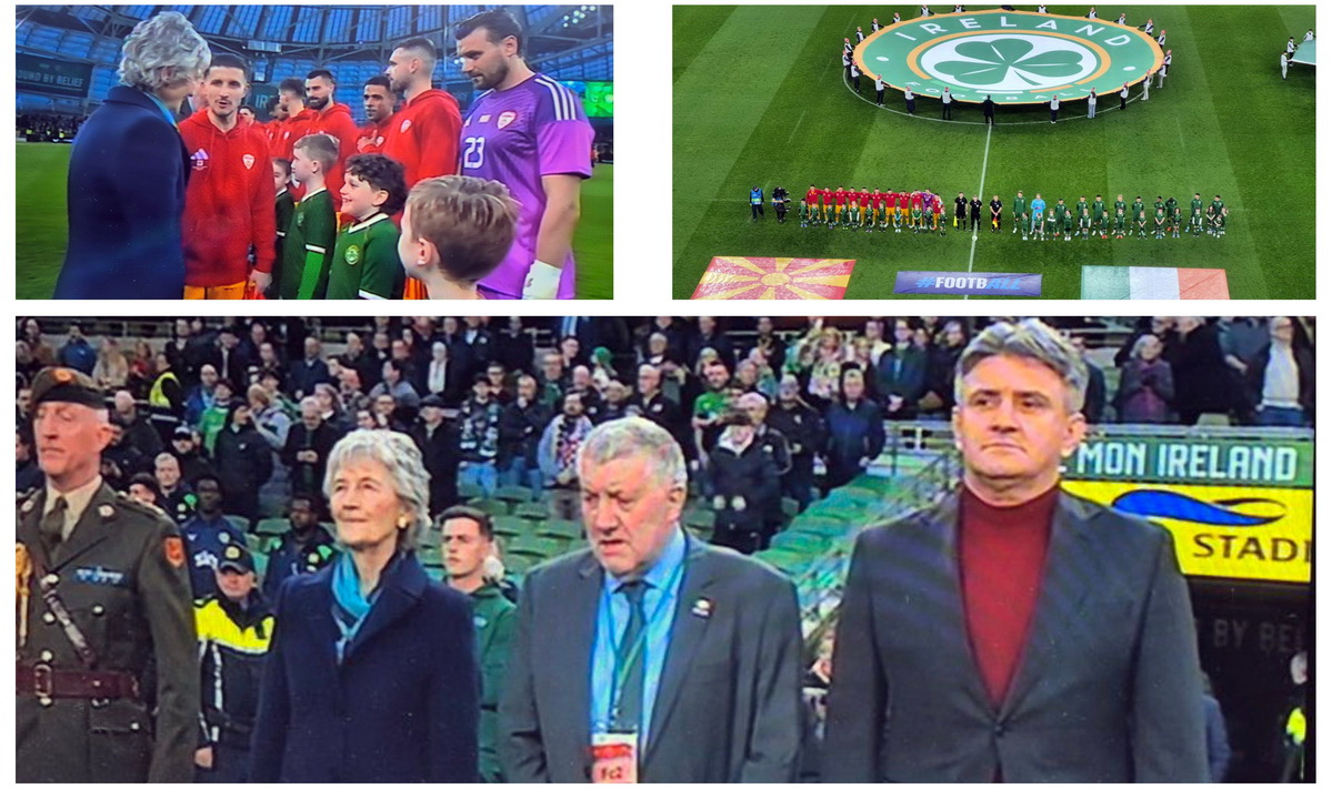 Коноли заедно со претседателот на ФФМ, Масар Омерагиќ и претседателот на Фудбалската асоцијација на Ирска, Пол Кук, пред почетокот на мечот ги поздравија репрезентативците на двата национални тим.