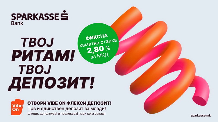 Шпаркасе Банка АД Скопје го претставува првиот депозит за млади на пазарот VIBE ON Флекси депозит – нов, модерен и единствен депозитен производ наменет за млади од 18 до 28 години, создаден за генерацијата што сака слобода, флексибилност и контрола над своите финансии.