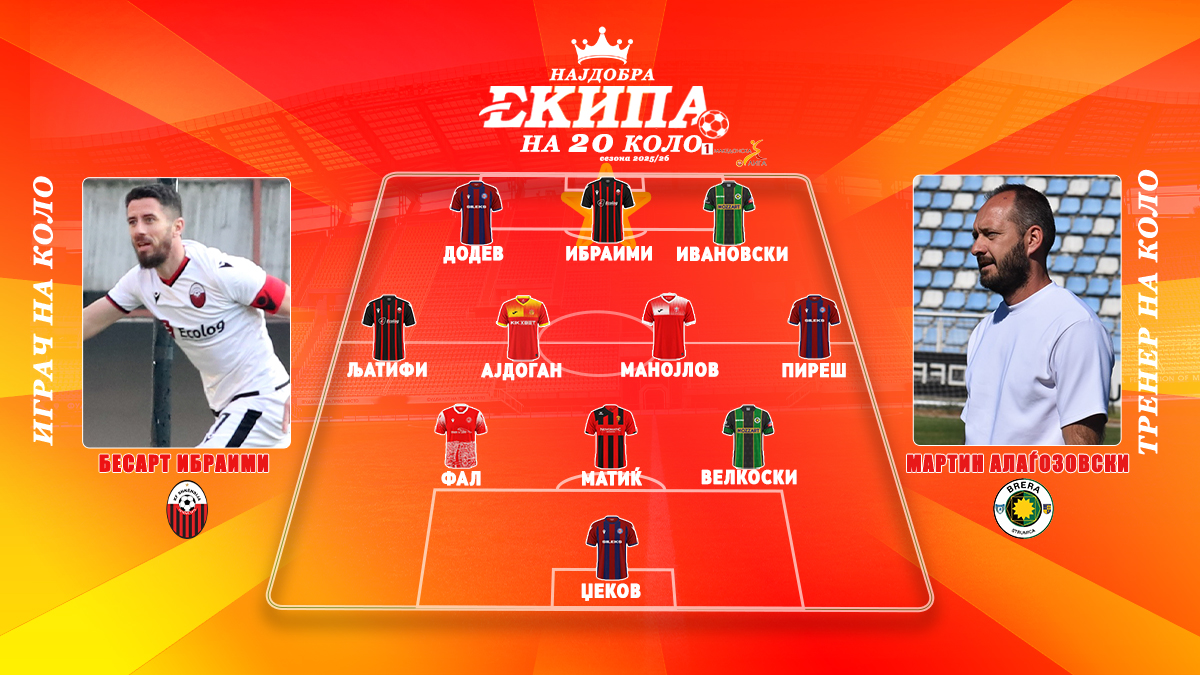 Првата лига оваа сезона е толку неизвесна што секој кикс може скапо да биде платен. Така Вардар одигра само 1-1 против Струга ТЛ на гостински терен, Шкендија победи, и се доближи на четири бодови пред меѓусебната пресметка во четврток. Тоа ќе биде виситнски спектакл. Струга ТЛ веќе заостанува многу, тешко дека ќе може да ги следи водечките, па така сега Вардар и Шкендија ќе водат вистинска битка за титулата. Ако Вардар победи со едната нога ќе се искачи на пиедесталот, во спротивно, секој друг резултат оди во прилог на Шкендија, која оваа пролет е залетана и има намера во одбрана на трофејот. Ги заврши настапите и во Европа, и сега максимално избраниците на Беќири се фокусираат кон титулата. Четвртото место е резервирано за Силекс, додека во долниот дел на табелата вистинска бркотница. Арсими, Брера и Башкими имаат по 26 бодови, Тиквеш 24, Македонија и Пелистер по 20, Работнички покажува знаци на живот, но и натаму е сето тоа далеку од идеална позиција, додека Шкупи е веќе со двете нозе во Втората лига. АП Брера со победата над директниот конкурент Башкими заплива во помирни води, Арсими е тука некаде, но со игрите кои ги прикажува во пролетниот дел не ветува многу. Истото се однесува и за Башкими. Во секој случај битката за опстанокот, односно за избегнување на третото место кое носи во Втората лига ќе биде пеколно. Како и за баражите. Ќе биде пеколно, секој бод, секој гол ќе биде важен. Исто како што ќе биде и за титулата, но таму работите ќе бидат појасни после меѓусебниот дуел во четврток. Ова е идеалниот тим на 20. коло според ЕКИПА. Во него се најдоа оние кои дадоа најголем придонес за нивните екипи да освојат бод(ови) од 20-тите натпревари во ПМФЛ. Бесарт Ибраими со двата гола против Пелистер го понесе епитетот најдобар, додека најдобар тренер е Мартин Алоѓозовски кој со неговиот тим успеа да извлече голема победа од жешкиот терен во Куманово.