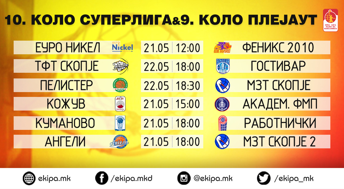 Богатиот ден започнува од 12 часот со натпреварот помеѓу Еуро Никел и Феникс 2010 во „Јасмин“, а ќе биде интересно да видиме дали вицешампионот ќе успее да му се реваншира на новлијата за поразот во првиот меч од Суперлигата и со серија на победи ќе влезе во разигрувањето за титула или пак скопјани ќе ја забележат и втората победа против најискусниот тим во првенството за крај на успешната сезона.