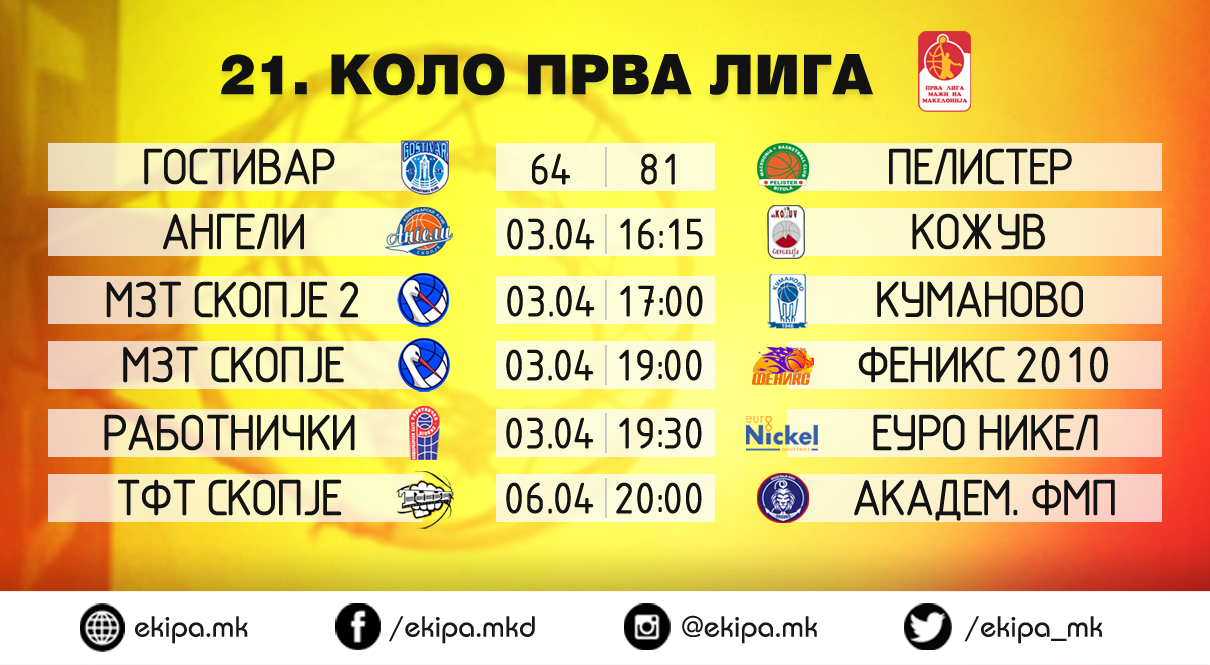 Дваесетипрвото коло од Првата кошаркарска лига започна со натпреварот на колото помеѓу Гостивар и Пелистер кој заврши со триумф на гостите од Битола, а продолжува денеска со четири нови возблудливи дуели.