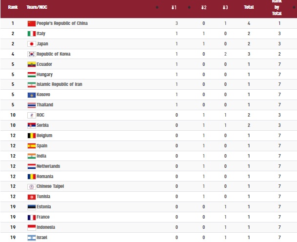 Најуспешна земја по првиот ден е Кина со вкупно четири освоени одликувања, од кои три златни и едно бронзено, пред Италија и Јапонија кои имаат по еден златен и еден сребрен медал.