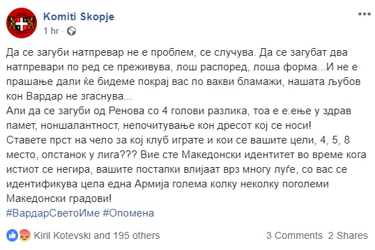 „Да се загуби натпревар не е проблем, се случува. Да се загубат два натпревари по ред се преживува, лош распоред, лоша форма…И не е прашање дали ќе бидеме покрај вас по вакви бламажи, нашата љубов кон Вардар не згаснува… Али да се загуби од Ренова со 4 голови разлика, тоа е е.ење у здрав памет, ноншалантност, непочитување кон дресот кој се носи! Ставете прст на чело за кој клуб играте и кои се вашите цели, 4, 5, 8 место, опстанок у лига??? Вие сте македонски идентитет во време кога истиот се негира, вашите постапки влијаат врз многу луѓе, со вас се идентификува цела една армија голема колку неколку поголеми македонски градови!“, истакнуваат „Комити“.
