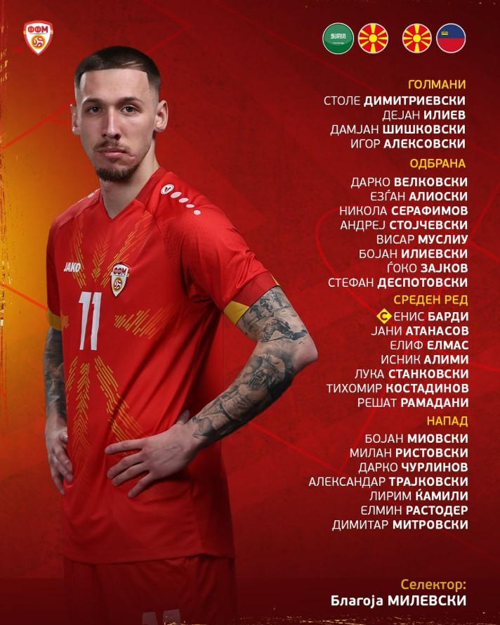 Селекторот на македонската репрезентација Благоја Милевски, го објави списокот на фудбалери за престојните два натпревари во септемврискиот циклус, односо пријателскиот меч против Саудиска Арабија во Прага на 4. септември, и квалификацискиот натпревар против Лихтенштајн во Скопје на 7. септември.