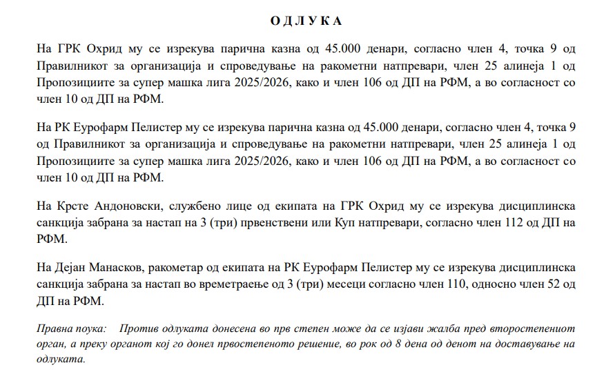 Воедно, и Охрид и Е. Пелистер се казнети со по 45.000 денари, додека Андоновски за својата улога во конфликтот со Манасков е казнет со три меча невршење на својата функција.