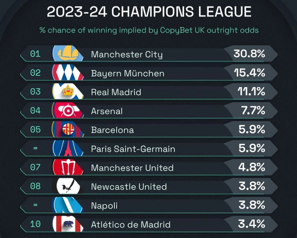 По вчерашната ждрепка за групите во новата сезона 2023/24 во Лигата на шампионите, веќе е дефинирана и процентуалната веројатност околу тоа кои се најголемите фаворити за освојување на најквалитетното европско клупско натпреварување.