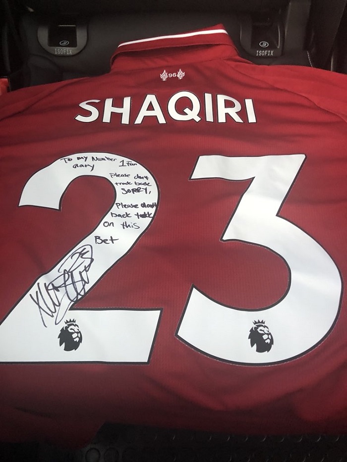 „За Гери, мојот најголем навивач. Немој да се премислуваш. Извини, немој да се премислуваш за овој облог, Џердан Шаќири“ – му напиша новиот фудбалер на Ливерпул на поранешниот капитен на Манчестер јунајтед.