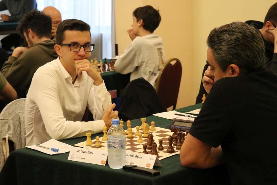 На третата табла ИМ Тони Лазов (2358) освои цел поен во дуелот од седмото коло против Горан Главинац (1993) и се врати во водечката група на играчи кои во последните две кола од Отвореното првенство на Македонија ќе атакуваат на титулата за 2024 година. Членот на ШК Алкалоид се соочи со Петрова одбрана, која води кон таканаречена Руска партија, чија репутација е дека води кон реми-позиција. Поради тоа ИМ Лазов направи транспозиција во Отворањето со 4 скокачи, па откако двајцата влегоа во ноторно изедначена средишница, успеа да спроведе стратегија и позиционо да го надигра противникот. Имено, неговиот белополен ловец од најслаба фигура на таблата (поради пешаците кои, исто така, беа на бели полиња), по неколку маневри стана клучен за плетење матна мрежа, а на крајот Лазов понуди жртва на топ, кога противникот одлучи дека е време да се предаде.