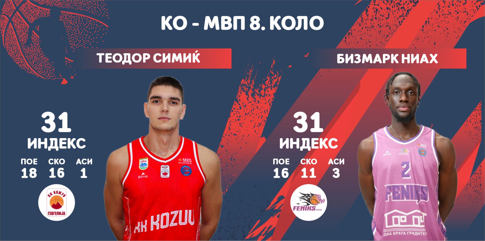 Кошаркарите на Кожув и Феникс 2010, Теодор Симиќ и Бизмарк Ниах го поделија признанието за најкорисен кошаркар на осмото коло од елитната македонска кошарка.