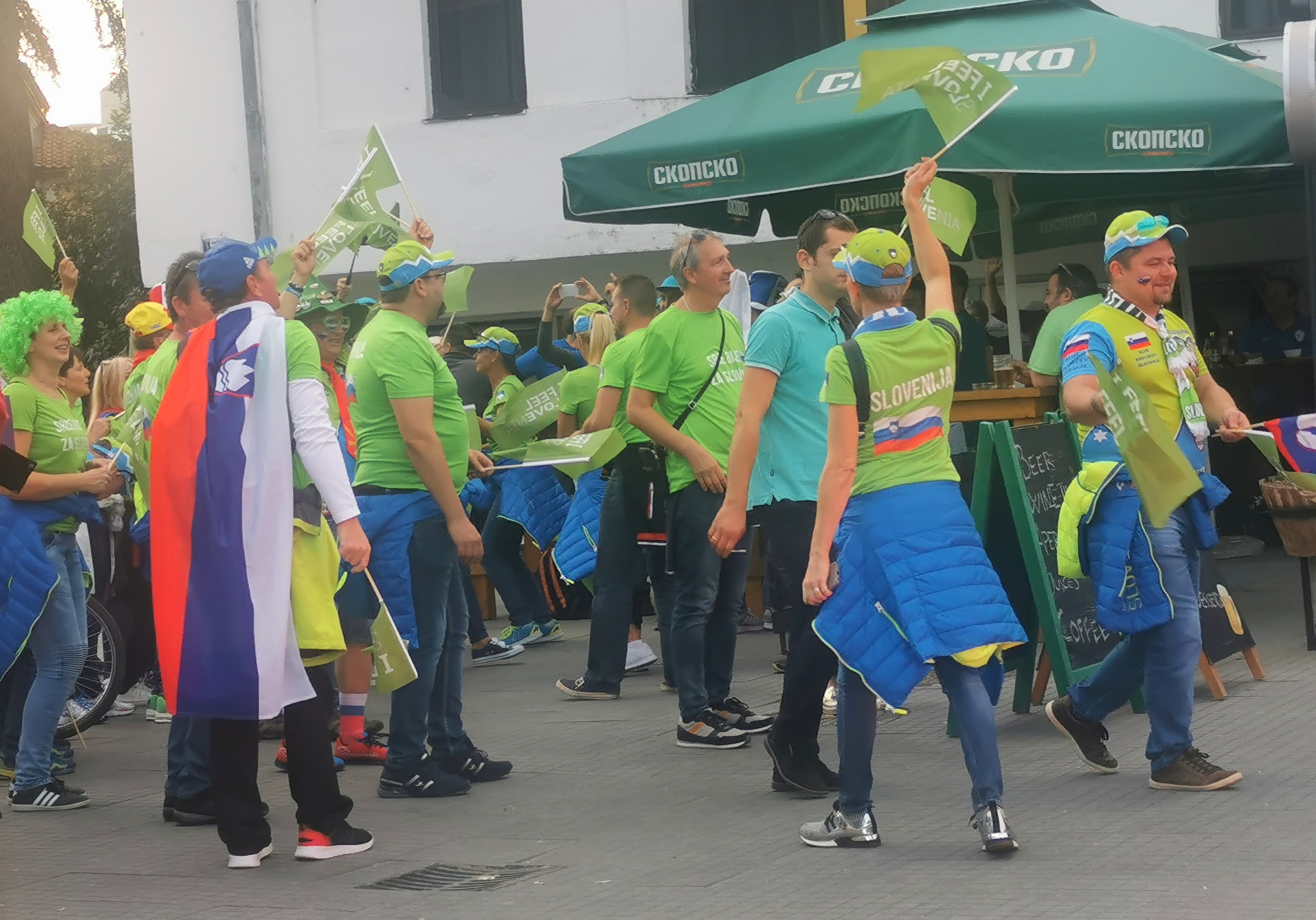 Словенечките навивачи во видно пријателско расположение попладнево го “окупираа” центарот на Скопје во очекување на квалификацискиот натпревар со Македонија.