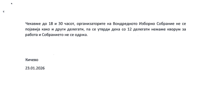 Дополнително, на закажаното собрание не се појавија ниту организаторите на истото, односно претседателот Марјан Ристевски, потпретседателот Далипи и делегатот Муамед Сејдини.