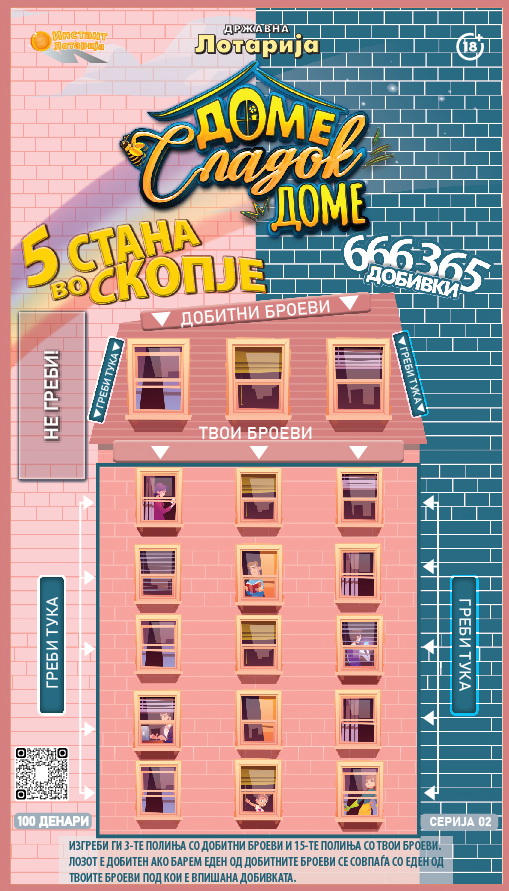Секој нов дом почнува со еден сладок сон, а понекогаш и со само еден лоз. Државна лотарија со гордост го претставува инстант лозот „Доме, сладок доме“, кој нуди шанси за парични добивки и можност да се оствари еден од најголемите животни соништа – сопствен дом во Скопје.