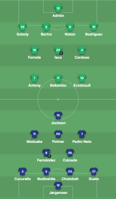 Тренерот на Шпанците, Мануел Пелегрини очекувано со Антони, Езалуи и Бакамбу ќе го нападне Челси. Од друга страна Енцо Мареска се одлучи на овој меч да стартува во навалната линија со Мадуеке, Палмер и Џексон.