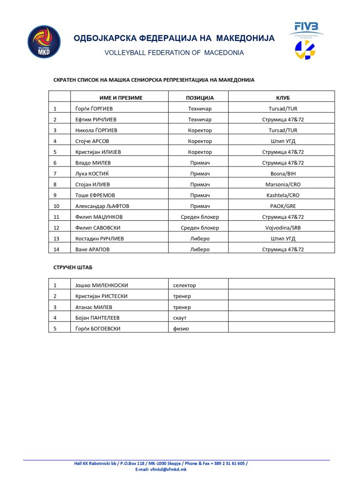 Селекторот Јошко Миленкоски ги избра 14-те „спартанци“ кои одат во поход на Атина, а единствена промена од составот кој го понесе товарот во Европската Златна лига е враќањето на средниот блокер Филип Маџунков.