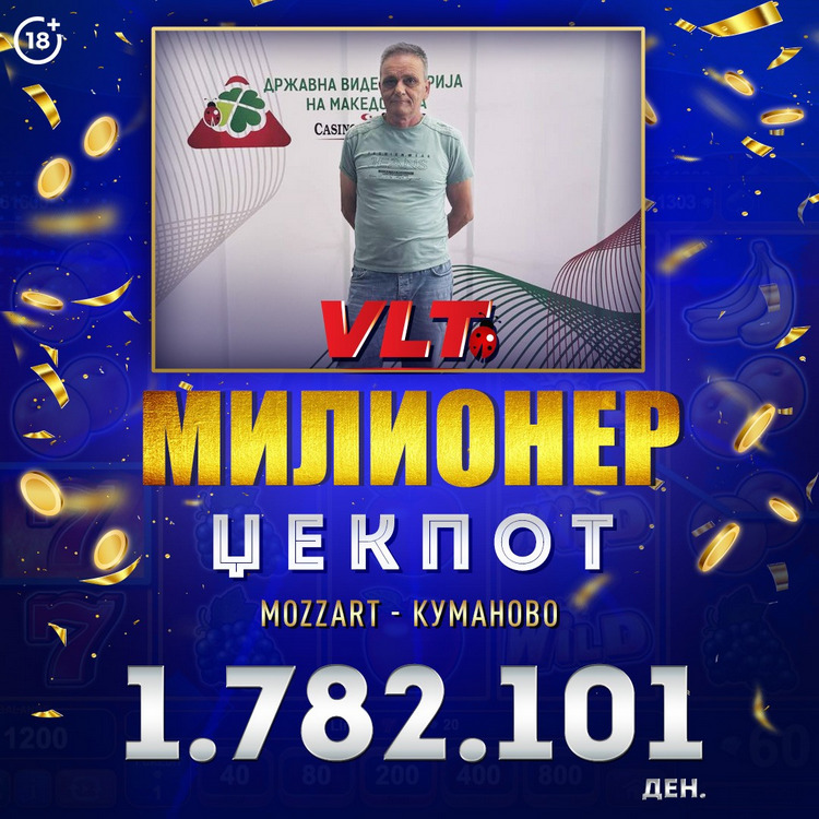 Во нашето семејство среќни добитници на МИЛИОНЕР џекпот имаме нов член. Горан Антиќ од Куманово, стана милионер благодарение на видеолотариските терминали на Видеолотарија Касинос Австрија. Тој забавувајќи се кај нашиот деловен соработник Делта Бет Моцарт во Куманово, на 25.08.2024, освои Милионер џекпот вреден 1.782.101 денари.