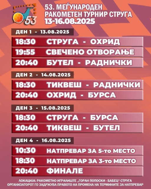 Денеска на отвореното игралиште „Горан Попоски Бабец“ стартува 53. издание на Меѓународниот ракометен турнир „Струга 2025“ на кој ќе учествуваат четири македонски и две екипи од странство.