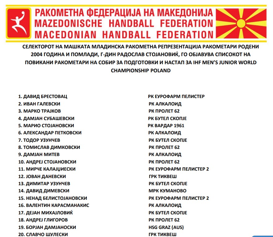 Селекторот на младинската репрезентација на Македонија, Раде Стојановиќ, го скрати списокот на ракометари кои ќе бидат во комбинација за настап на претстојното светско првенство што ќе се одржи во Полска.