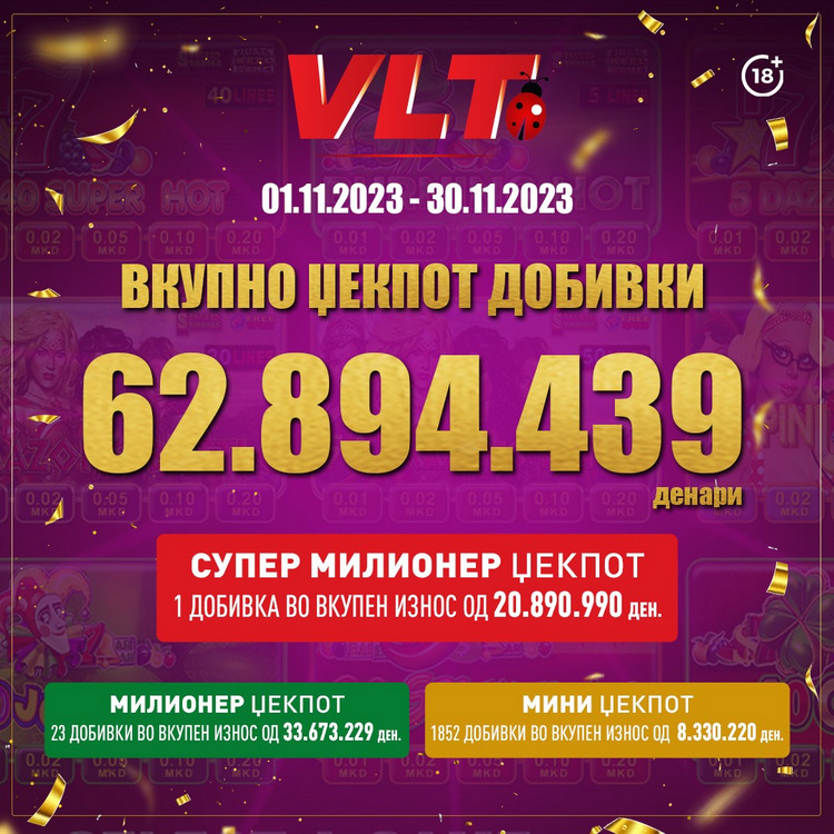 Во ноември го имавме рекордниот износ за најпосакуваниот ВЛТ џекпот – СУПЕР МИЛИОНЕР ЏЕКПОТ, кој има добитна вредност од 14 до 21 милион денари. С.Б. од Скопје го освои рекорден износ на СУПЕР МИЛИОНЕР џекпот  вреден фантастични 20 890 990 денари. Најпосакуваната добивка СУПЕР МИЛИОНЕР  беше освоен на видеолотариските терминали во Скопје на 13.11.2023.