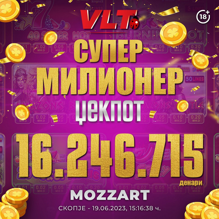 Најпосакуваниот ВЛТ џекпот – СУПЕР МИЛИОНЕР ЏЕКПОТ има добитна вредност од 14 до 21 милион денари. Оваа година рекордниот износ го освои играч од Струга, вреден 20.577.224,00 денари.