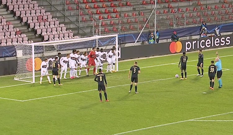 Капитенот на Ајакс изведе индиректен удар од работ на петерецот, а буквално сите 11 фудбалери на Митјиланд се наредија на гол-линијата. Сепак, и тоа не го спречи српскиот голгетер, кој успеа да го најде патот до мрежата.