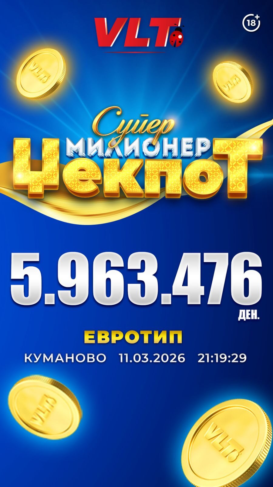 Најпосакуваната ВЛТ добивка е освоена со играта „Вампајр најт“, на видеолотариските терминали кај деловниот соработник „Евротип“, на 11.03.2026 година, во Куманово.