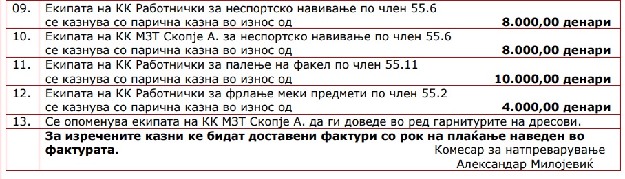 Двата тима се казнети со по 8.000 денари за неспортското скандирање на нивните навивачки групи, а „центарци“ ќе платат и дополнителни 14.000 денари (десет илјади за фрлениот факел и четири илјади за фрлање на меки предмети на терен.