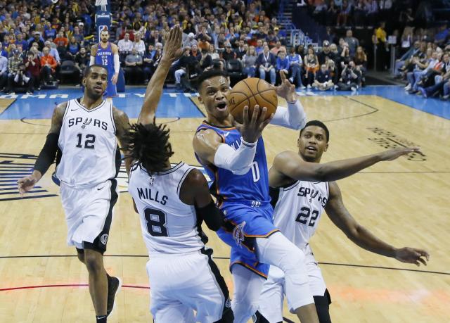 Расел Вестбрук го запиша 19-от „трипл-дабл“ во сезонава, а 98-ми во својата кариера со 21 поен, 12 скока и 10 асистенции. А, Сан Антонио со 29-от пораз во сезонава си ја загрозија својата плеј-оф позиција, и сега имаат само победа повеќе од ЛА Клиперс, Денвер и Јута кои се борат за осмото место.