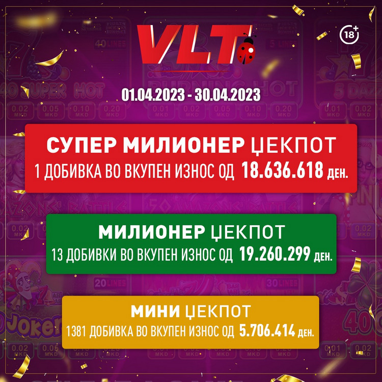 И април се покажа како среќен месец за играчите на видеолотариските терминали. Во текот на овој месец, Видеолотарија им исплати на играчите фантастичнa сума од вкупно 43.603.331,00 денари за добивки.