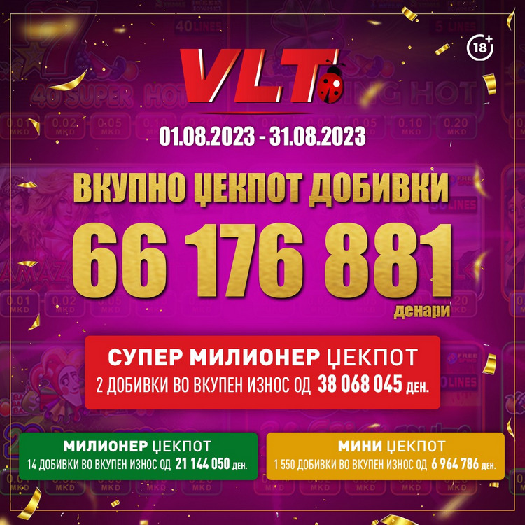 Август е еден од најдобитните месеци во 2023 за играчите на видеолотариските терминали.  Во текот на овој месец, Видеолотарија на играчите кои се забавуваа на видеолотариските терминали, им исплати фантастична  сума од вкупно 66 176 881  денари за ВЛТ џекпот добивки.