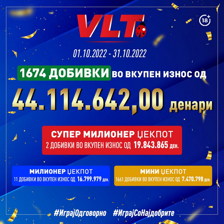 За добивката МИЛИОНЕР ЏЕКПОТ, играчите во октомври поделија 17.000.000,00 денари. Најголемата МИЛИОНЕР ЏЕКПОТ добивка вредна 1.734.916,00 денари беше освоена на 27.10.2022 во Златна Копачка во Тетово.