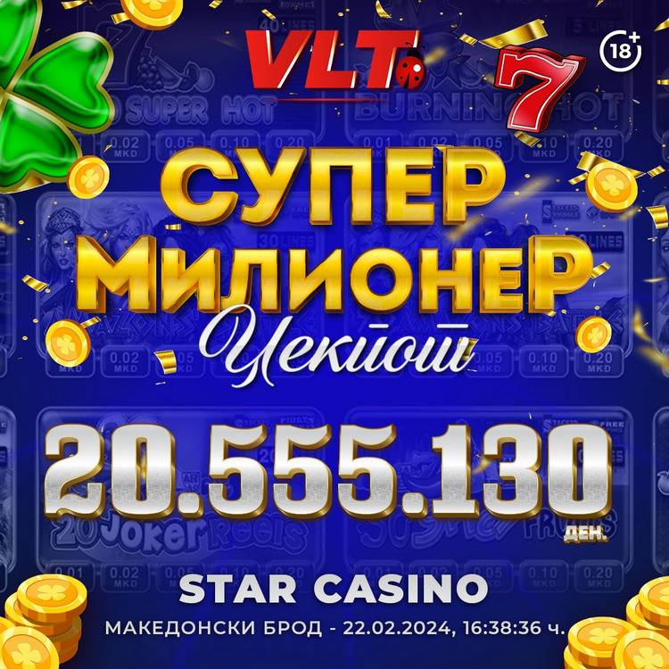 Најновиот СУПЕР МИЛИОНЕР џекпот е вреден 20.555.130 денари. Го освои играч кај нашиот деловен соработник Гаминг Професионал Казино СТАР во Македонски Брод, на 22.02.2024 во 16:38.