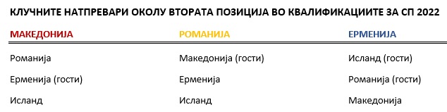Во една таква ситуација Македонија е во најповолна ситуација, бидејќи на домашен терен ги пречекува Романија и Исланд, а одлучувачки може да биде гостувањето на Ерменија следниот месец. Но, со предуслов утре да се слави против Романците во Скопје.